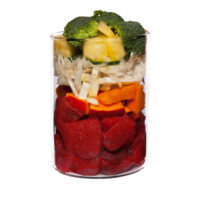 仔牛の心臓(25%)、仔牛の肺(12%)、仔牛の脂肪(7%)、じゃがいも、人参(8%)、ズッキーニ、カボチャ(8%)、メロン、リンゴ、亜麻仁油、ココナッツ粉、ダンデライオン*、バーチリーフ*、パセリ*、チアシード、カレンデュラ*、イラクサ*、オイスターシェル、海藻*、ビタミン(A、D3、E、B1、B2、B12)、ビオチン、パントテン酸、葉酸、銅、マンガン、ヨウ素、亜鉛、セレン、カルシウム、リン、マグネシウム、ナトリウム、L-カルニチン