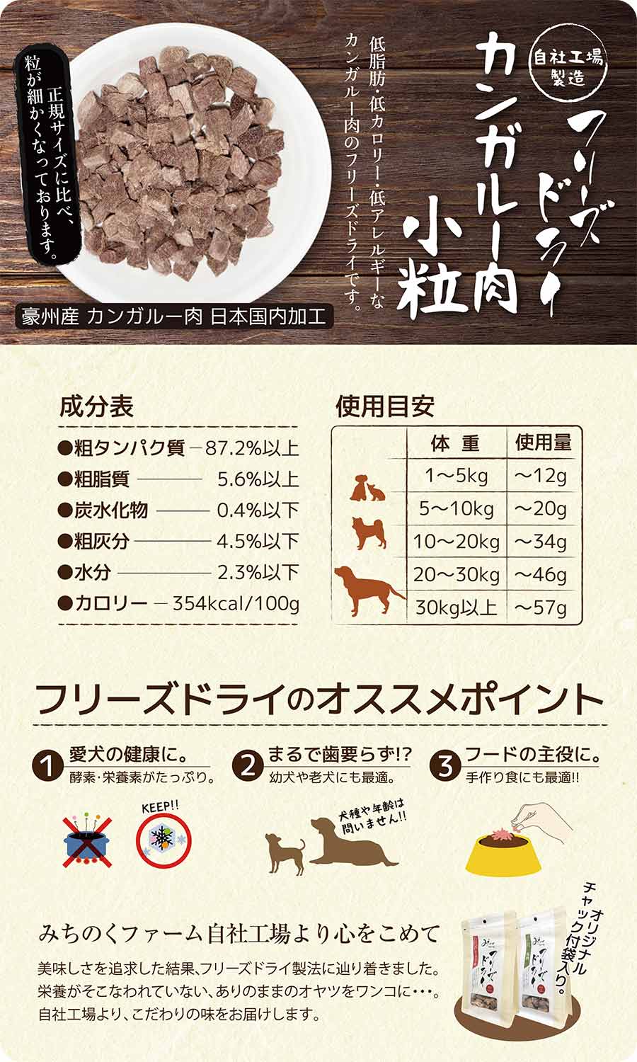 与えやすい小粒タイプ。 低脂肪・低アレルギー・高タンパクなカンガルー肉のフリーズドライです。 フリーズドライならではの旨味・香り・質感・栄養素。 【ご注意】 脂肪分が少ないカンガルー肉な故、稀に硬めのスジ部分が混ざる事がございます。 予めご了承下さい。